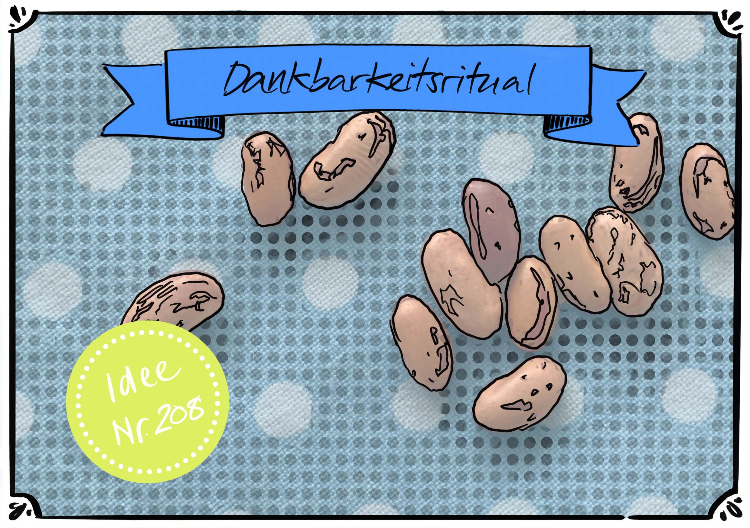 Morgens werden ein paar trockene Bohnen in der rechten Hosentasche mitgenommen. Bei jedem schönen Moment, den Du während des Tages erlebst, wanderte eine Bohne in die linke Hosentasche. Am Abend werden die Bohnen aus der linken Hosentasche hervorgenommen, und jeder erzählt von seinen schönen Momenten, die er während des Tages gesammelt hat.